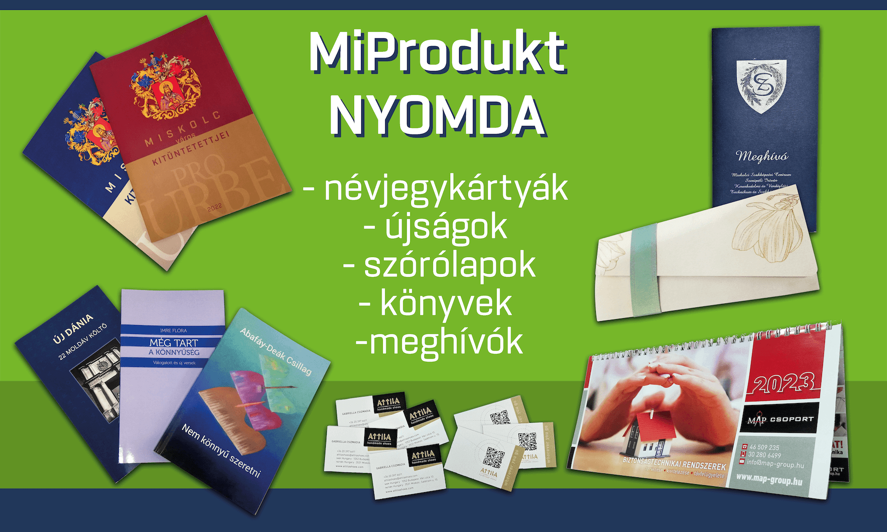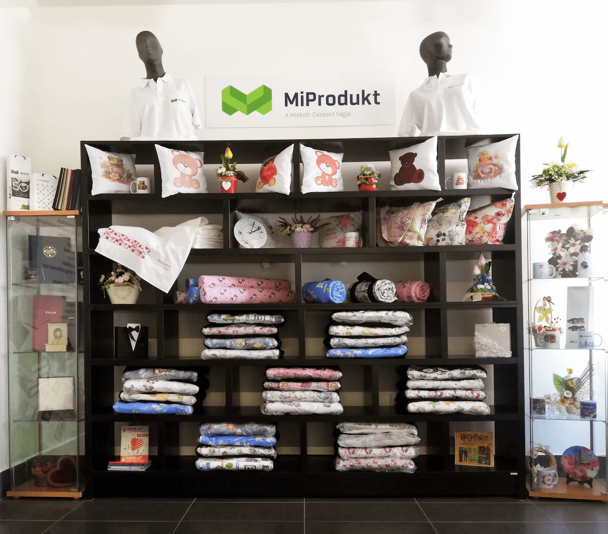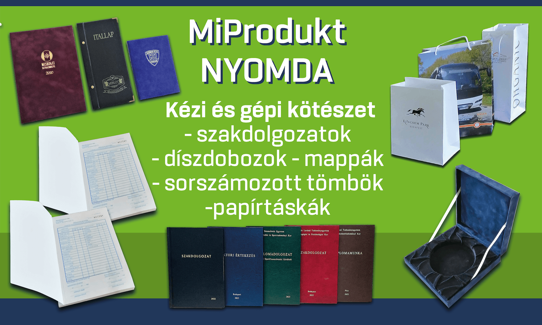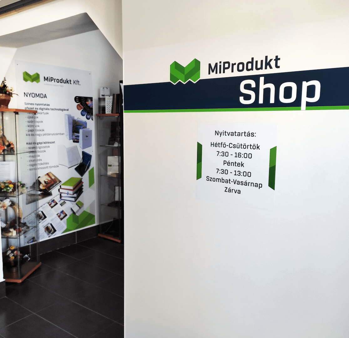Bemutatótermünkben lehetőség van megtekinteni, valamint megrendelni saját előállítású nyomdai és varrodai termékeinket, egyedi készítésű tárgyainkat.